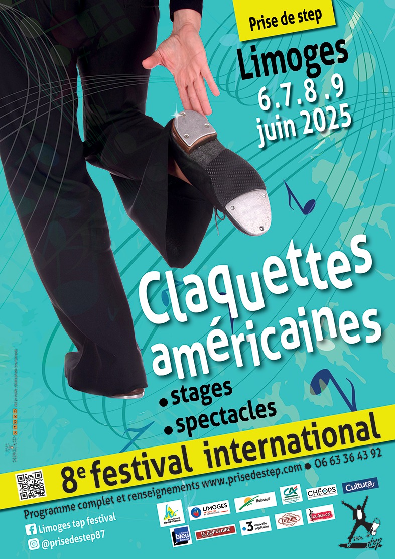 07/06/2025 (21:00) à BOISSEUIL (87) Spectacle des professeurs du 8ème Festival de Claquettes de Limoges : Fabien Ruiz, Charles renato, Estefania Porqueras, Lorraine Leblanc-Davis, Simeon Weedall + quintet de jazz style New-Orleans. En 1ère partie : démonstration des élèves.
