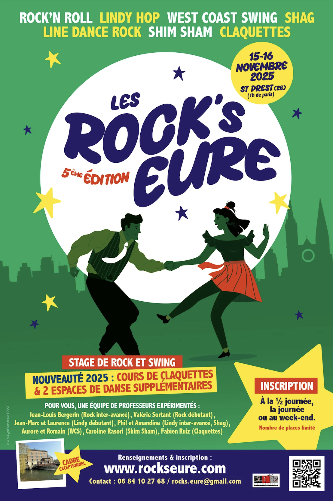 15 et 16/11/2025 à SAINT-PREST (28) Les Rock'sEure - 5e édition : Stage de danse Rock et Swing avec 6 professeurs + Claquettes avec Fabien Ruiz. 3 niveaux + découverte + improvisation. Soirée dansante. Plus d'informations