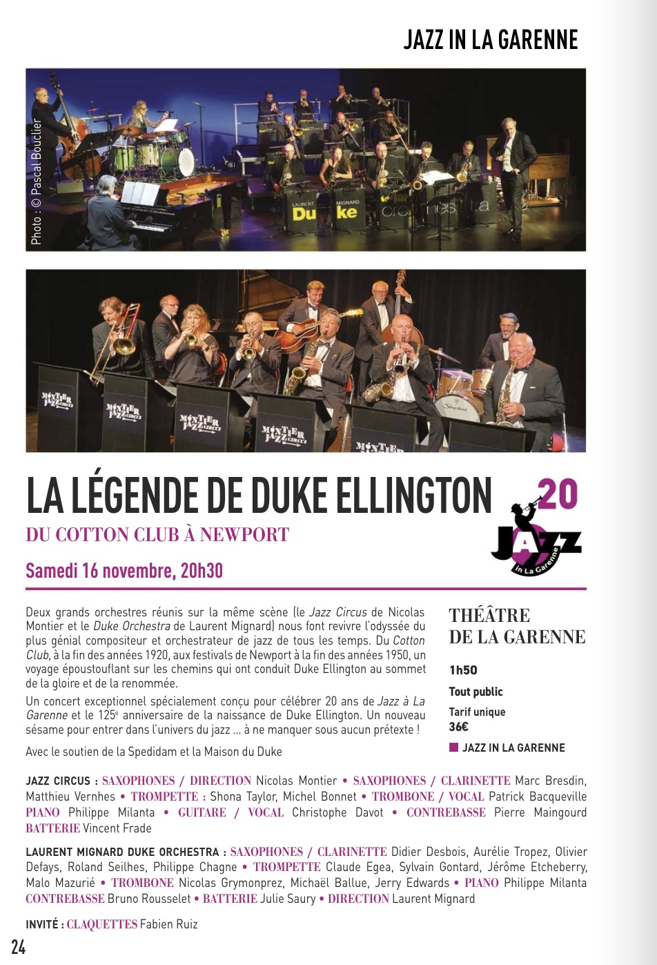 16/11/2024 (20:30) à LA GARENNE-COLOMBES (92) CONCERT : "LA LÉGENDE DE DUKE ELLINGTON" dans le cadre du festival Jazz in La Garenne, 2 grands orchestres réunis sur une même scène, le Jazz Circus de Nicolas Montier (10 MUSICIENS) + le Duke Orchestra de Laurent Mignard (16 MUSICIENS) invitent le claquettiste Fabien Ruiz. Plus d'informations