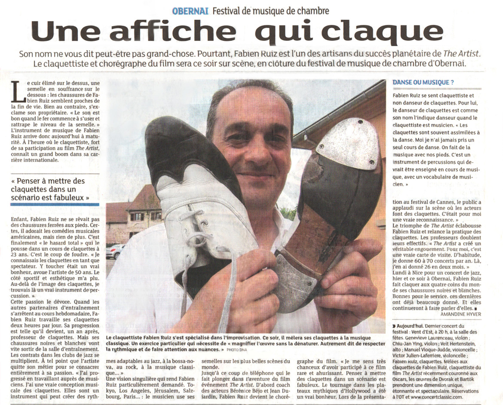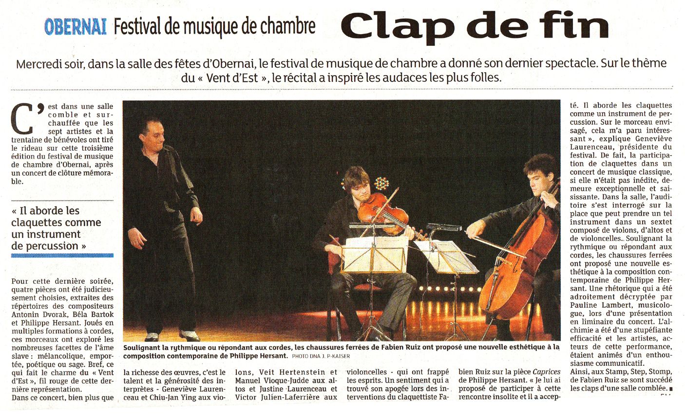 "Un sentiment qui a trouvé son apogée lors de l'intervention du claquettiste Fabien Ruiz sur la pièce CAPRICES de Philippe Hersant. Il aborde les claquettes comme un instrument de percussion. L'alchimie a été d'une stupéfiante efficacité et les artistes, acteurs de cette performance, étaient animés d'un enthousiasme communicatif. Ainsi, aux Stamp, Step, Stomp de Fabien Ruiz se sont succédé les claps d'une salle comblée."