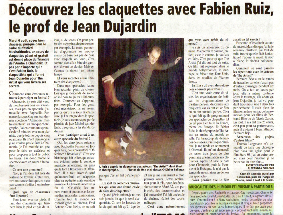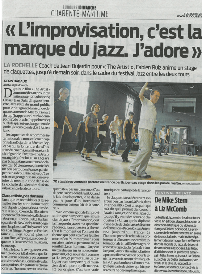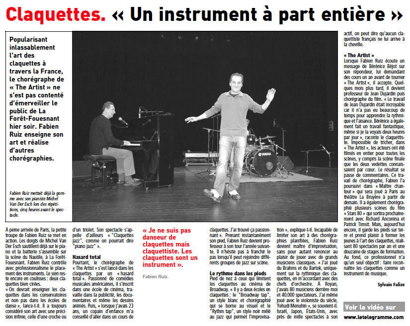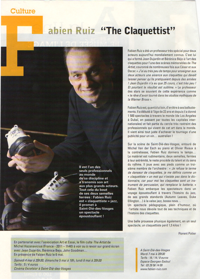 "Fabien Ruiz a la musique au bout des pieds... Ce fan de Fred Astaire donne en un peu plus d'une heure une magistrale leçon de claquettes. un vrai spectacle, entrecoupé d'explications brèves et claires sur son art."