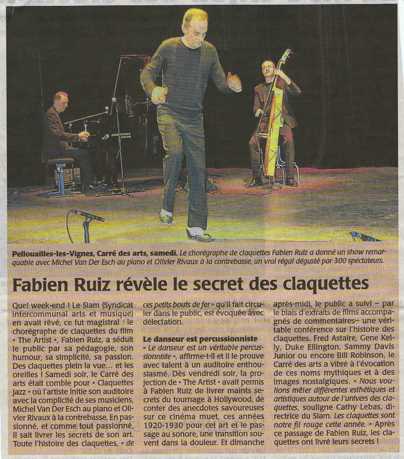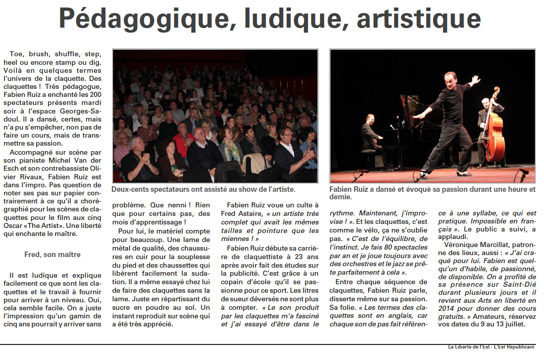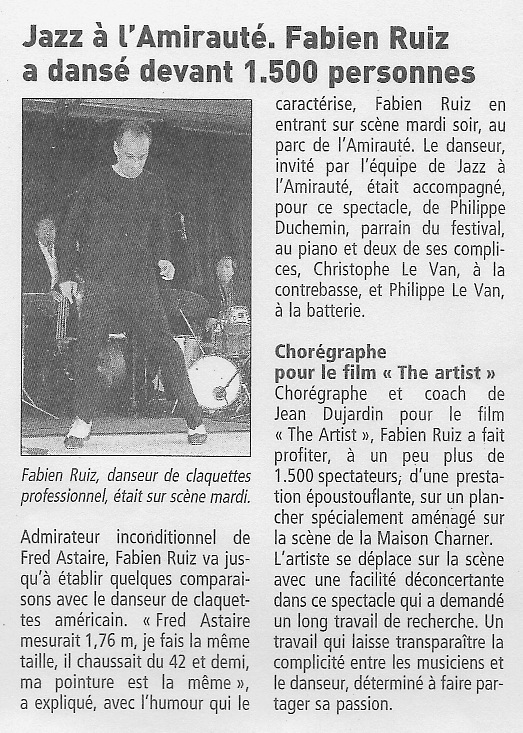 "Claquettiste confirmé et passionné, Fabien Ruiz chauffe les planches avec une énergie aussi inépuisable qu'inspirée... Le tout avec un humour rehaussé par la complicité qui le lie à ses deux musiciens : Michel Van Der Esch au piano et Olivier Rivaux à la contrebasse... on retrouve lorsqu'il fait crépiter la scène toute la nervosité, mais également toute l'élégance, tout le chic de la rythmique jazz. Fabien Ruiz est un danseur raffiné et ses souliers de fer chaussent des pieds de velours."
